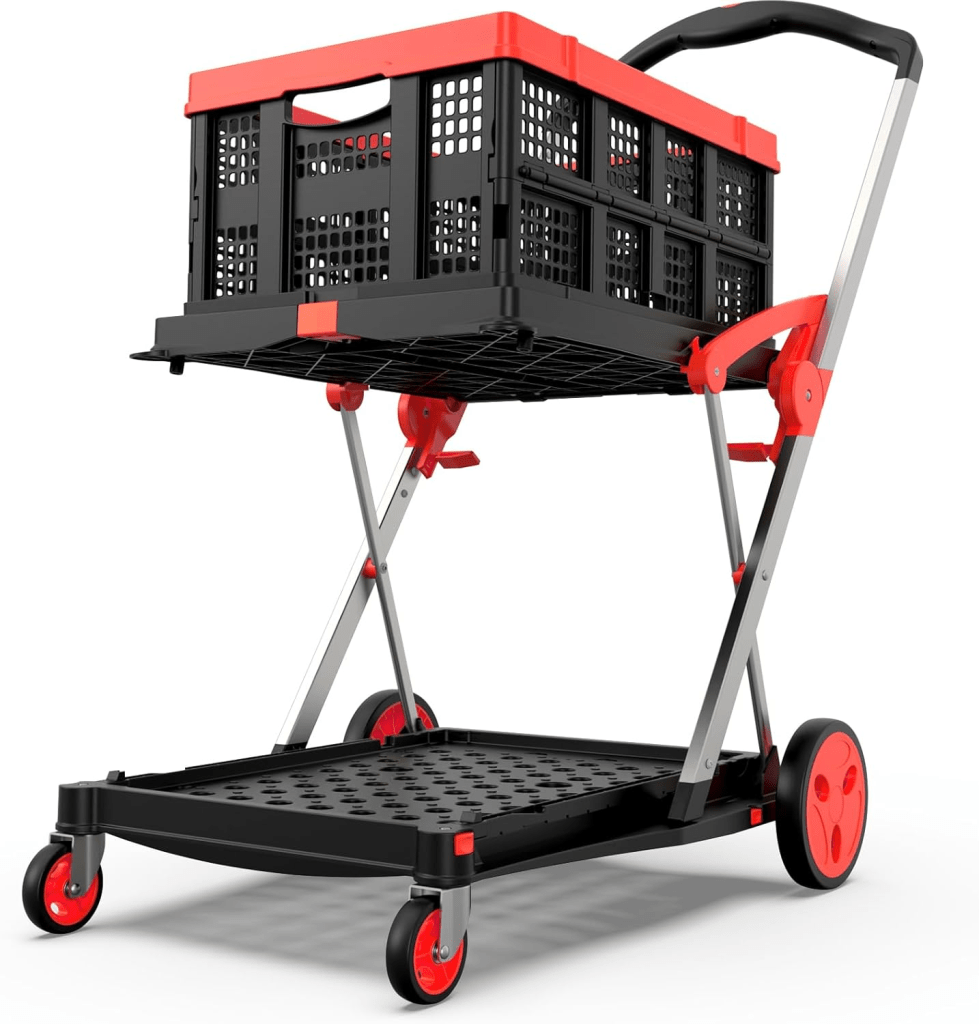 Folding Shopping Cart, 200 lbs Capacity Grocery Cart on Wheels Foldable, Multi-Functional Dolly Cart Collapsible Cart, Platform Hand Truck with Foot Brake, Utility Cart with Storage Crate